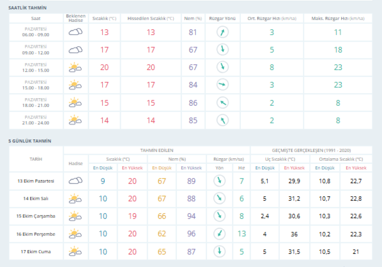 13 Ekim Pazartesi: Çok bulutlu. En düşük sıcaklık 9, en yüksek sıcaklık 20 derece olacak.