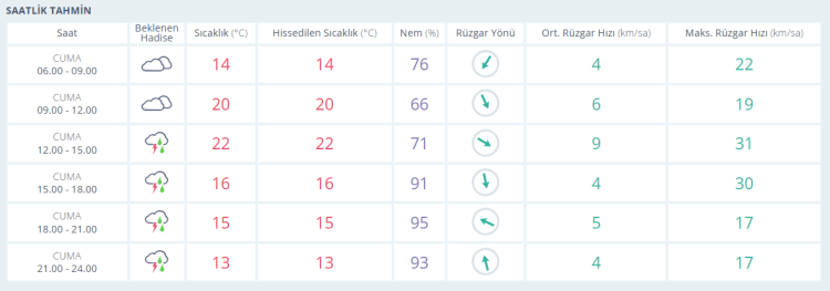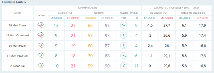 28 Mart Şubat 2025 Cuma: Gök gürültülü sağanak yağışlı. En düşük sıcaklık 13, en yüksek sıcaklık 22 derece olacak.