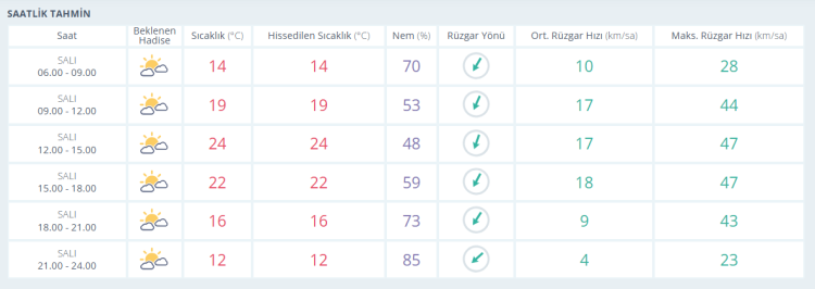 14 Mayıs Çarşamba: Parçalı bulutlu. En düşük sıcaklık 6, en yüksek sıcaklık 19 derece olacak.