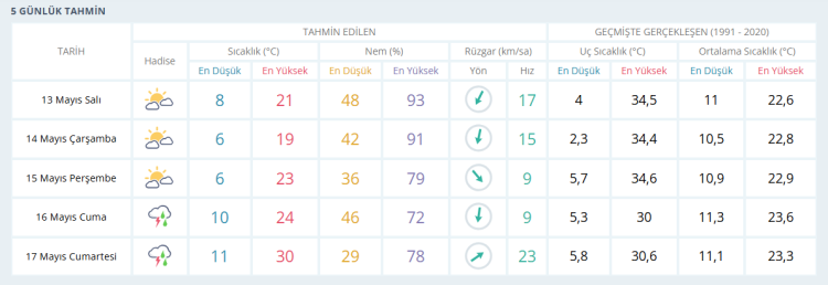 13 Mayıs Salı: Parçalı bulutlu. En düşük sıcaklık 8, en yüksek sıcaklık 21 derece olacak.