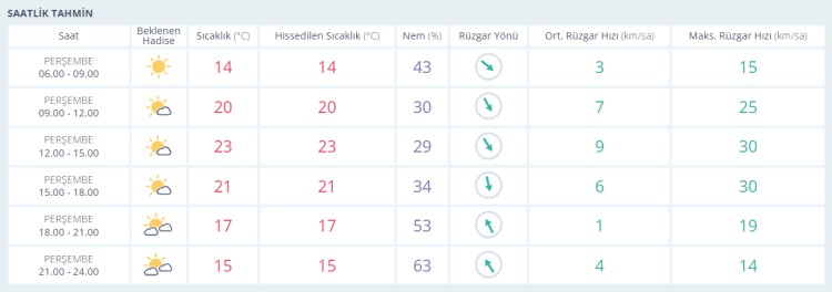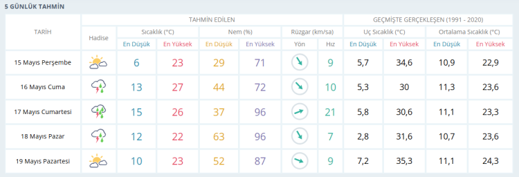 15 Mayıs Perşembe: Parçalı bulutlu. En düşük sıcaklık 6, en yüksek sıcaklık 23 derece olacak.