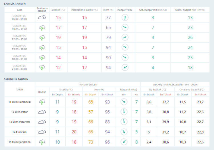 11 Ekim Cumartesi: Sağanak yağışlı. En düşük sıcaklık 11, en yüksek sıcaklık 19 derece olacak.