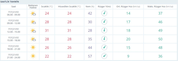 15.00 - 18.00 saatleri arasında ise sıcaklık biraz düşerek 28°C oluyor ancak nem oranı %35’e yükseliyor. Akşam saatlerinde (18.00 - 21.00) gökyüzü tamamen açılıyor, sıcaklık 26°C’ye iniyor. Günün son saatleri olan 21.00 - 24.00 arasında ise sıcaklık 22°C’ye kadar düşerken, nem oranı %57’ye ulaşıyor. Rüzgar bu saatlerde biraz daha hafif esiyor: 9 km/sa ortalama hızla.