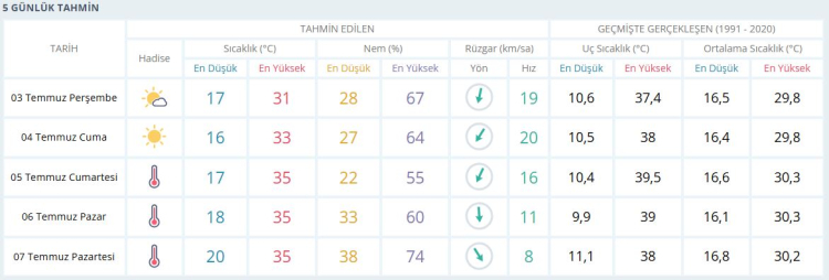 07 Temmuz Pazartesi: Haftaya yine sıcak bir başlangıç yapılıyor. Gündüz sıcaklığı yine 35°C civarında olurken, gece en düşük 20°C ölçülecek. Nem oranı %38’e kadar çıkıyor.
