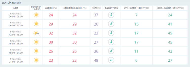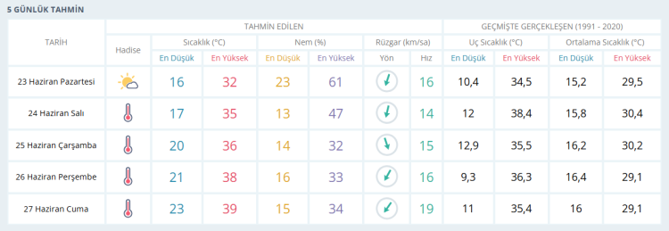 23 Haziran Pazartesi: Az bulutlu. En düşük sıcaklık 16, en yüksek sıcaklık 32 derece olacak.