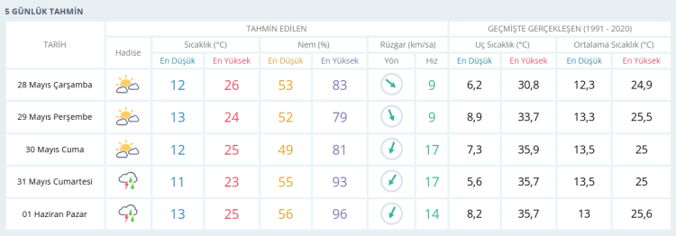 28 Mayıs Çarşamba: Parçalı bulutlu. En düşük sıcaklık 12, en yüksek sıcaklık 26 derece olacak.