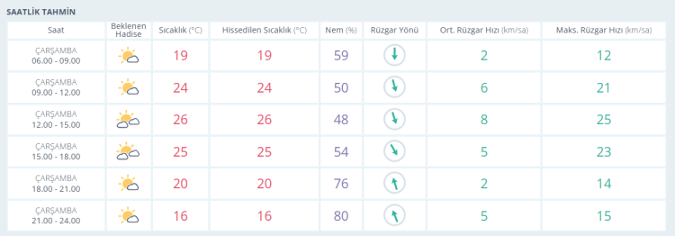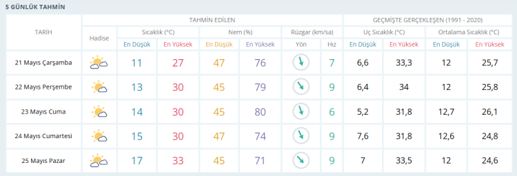21 Mayıs Çarşamba: Parçalı bulutlu. En düşük sıcaklık 11, en yüksek sıcaklık 27 derece olacak.