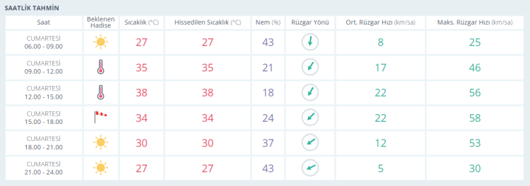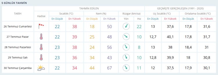 26 Temmuz Cumartesi: Rüzgarlı. En düşük sıcaklık 22, en yüksek sıcaklık 38 derece olacak.