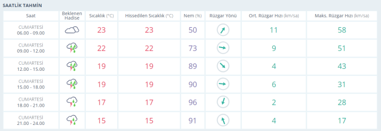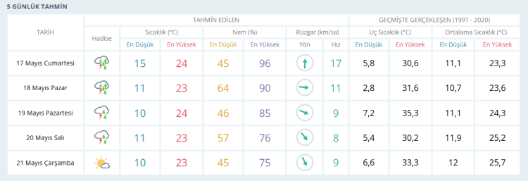 17 Mayıs Cumartesi: Kuvvetli gökgürültülü sağanak yağışlı. En düşük sıcaklık 15, en yüksek sıcaklık 24 derece olacak.