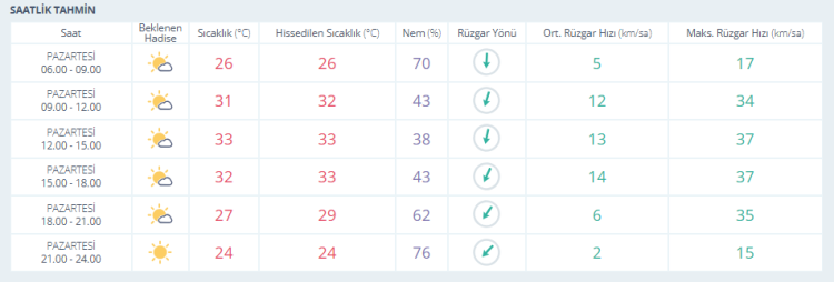 4 Ağustos Pazartesi: Az bulutlu. En düşük sıcaklık 21, en yüksek sıcaklık 33 derece olacak.