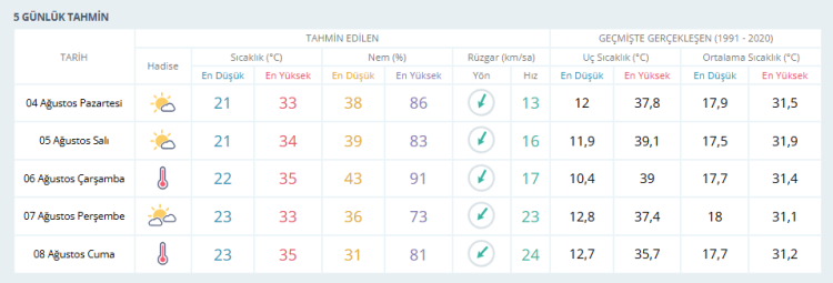 5 Ağustos Salı: Az bulutlu. En düşük sıcaklık 21, en yüksek sıcaklık 34 derece olacak.