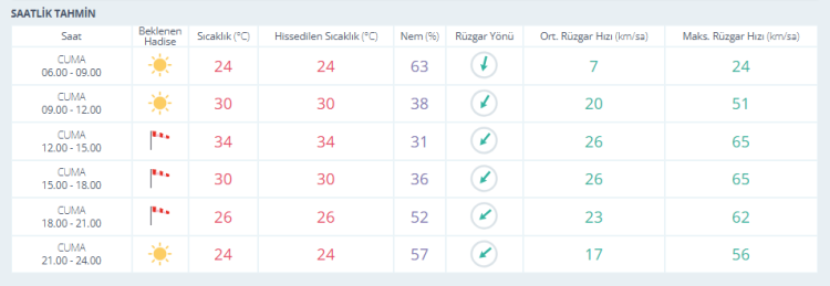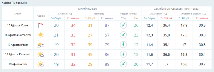 15 Ağustos Cuma: Rüzgarlı. En düşük sıcaklık 20, en yüksek sıcaklık 34 derece olacak.