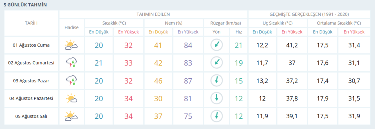 5 Ağustos Salı: Parçalı bulutlu. En düşük sıcaklık 20, en yüksek sıcaklık 34 derece olacak.