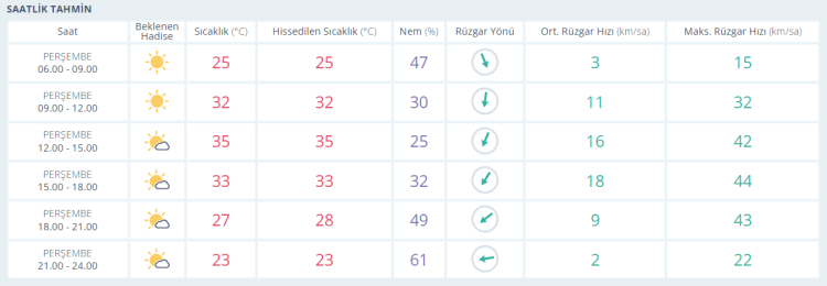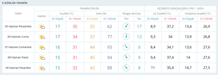 5 Haziran Perşembe: Az bulutlu. En düşük sıcaklık 17, en yüksek sıcaklık 35 derece olacak.