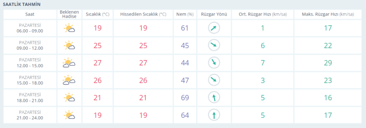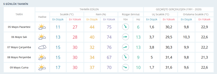 5 Mayıs Pazartesi: Parçalı bulutlu. En düşük sıcaklık 11, en yüksek sıcaklık 27 derece olacak.
