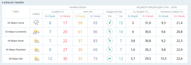 6 Mayıs Salı: Az bulutlu. En düşük sıcaklık 12, en yüksek sıcaklık 30 derece olacak.