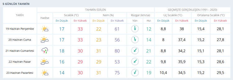 19 Haziran Perşembe: Az bulutlu. En düşük sıcaklık 14, en yüksek sıcaklık 29 derece olacak.