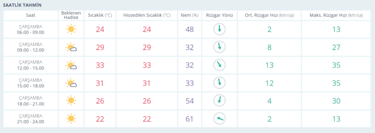 4 Haziran Çarşamba: Az bulutlu. En düşük sıcaklık 14, en yüksek sıcaklık 33 derece olacak.