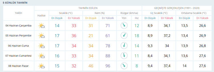 5 Haziran Perşembe: Az bulutlu. En düşük sıcaklık 17, en yüksek sıcaklık 36 derece olacak.