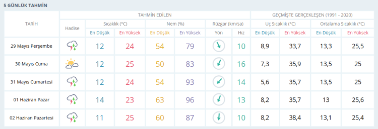 31 Mayıs Cumartesi: Parçalı bulutlu. En düşük sıcaklık 12, en yüksek sıcaklık 25 derece olacak.
