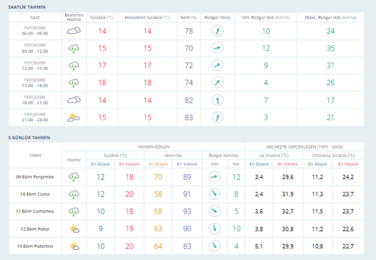 9 Ekim Perşembe: Sağanak yağışlı. En düşük sıcaklık 12, en yüksek sıcaklık 18 derece olacak.