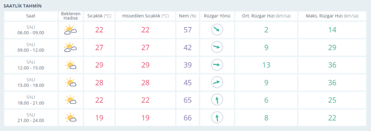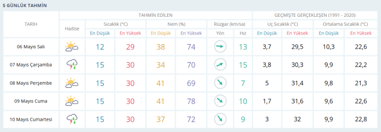 6 Mayıs Salı: Parçalı bulutlu. En düşük sıcaklık 12, en yüksek sıcaklık 29 derece olacak.