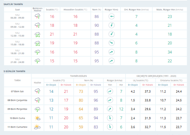 7 Ekim Pazartesi: Gök gürültülü sağanak yağışlı. En düşük sıcaklık 14, en yüksek sıcaklık 21 derece olacak.