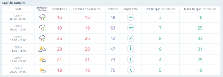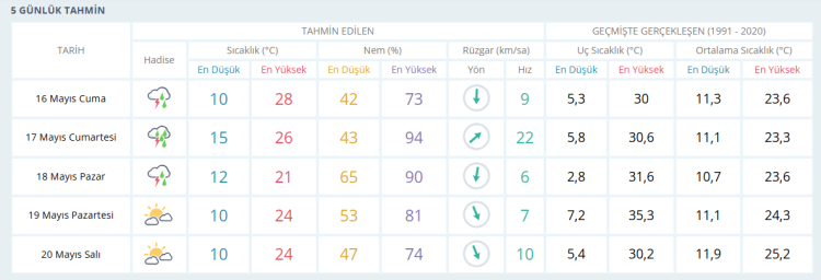 16 Mayıs Cuma: Gökgürültülü sağanak yağışlı. En düşük sıcaklık 10, en yüksek sıcaklık 28 derece olacak.