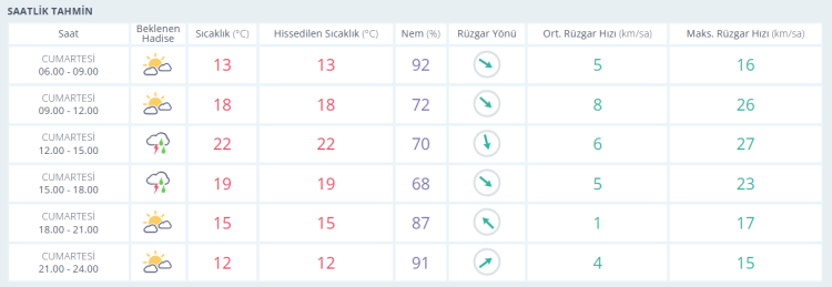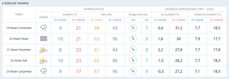 19 Nisan Cumartesi: Gökgürültülü sağanak yağışlı. En düşük sıcaklık 9, en yüksek sıcaklık 21 derece olacak.