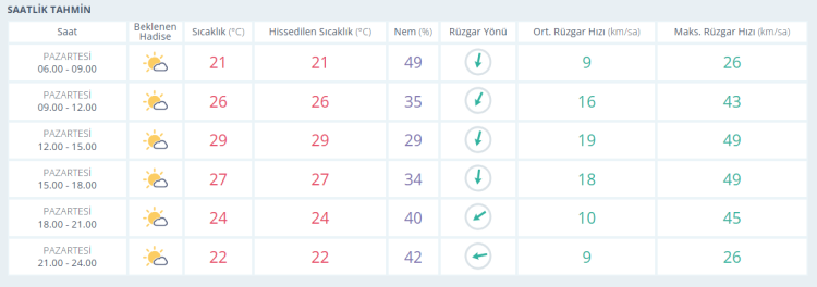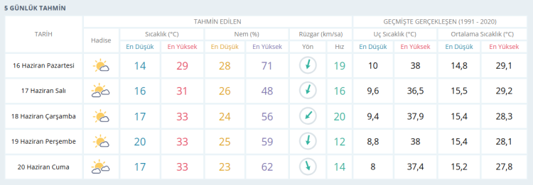 16 Haziran Pazartesi: Az bulutlu. En düşük sıcaklık 14, en yüksek sıcaklık 29 derece olacak.