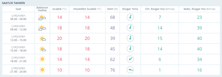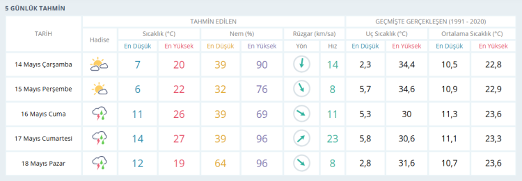 14 Mayıs Çarşamba: Parçalı bulutlu. En düşük sıcaklık 7, en yüksek sıcaklık 20 derece olacak.