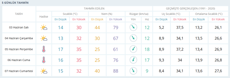 5 Haziran Perşembe: Sıcak. En düşük sıcaklık 17, en yüksek sıcaklık 35 derece olacak.