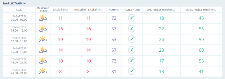 29 Nisan Salı: Parçalı bulutlu. En düşük sıcaklık 6, en yüksek sıcaklık 17 derece olacak.