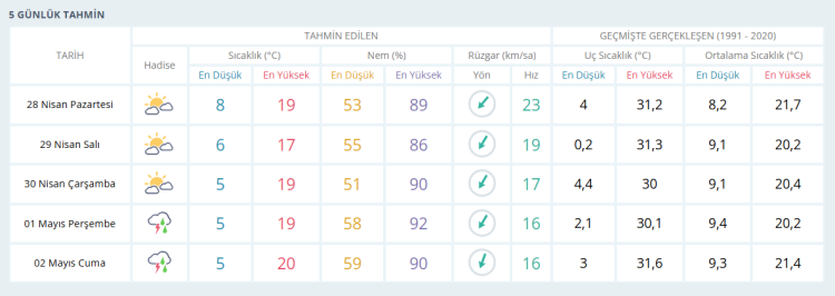 30 Nisan Çarşamba: Parçalı bulutlu. En düşük sıcaklık 5, en yüksek sıcaklık 19 derece olacak.