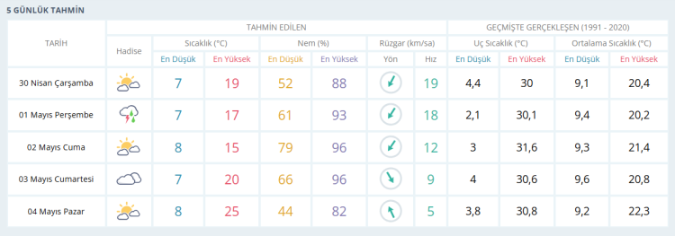 30 Nisan Çarşamba: Parçalı bulutlu. En düşük sıcaklık 7, en yüksek sıcaklık 19 derece olacak.