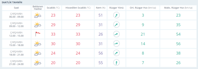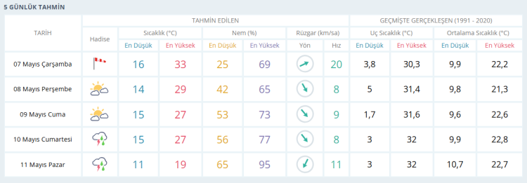 7 Mayıs Çarşamba: Rüzgarlı. En düşük sıcaklık 16, en yüksek sıcaklık 33 derece olacak.