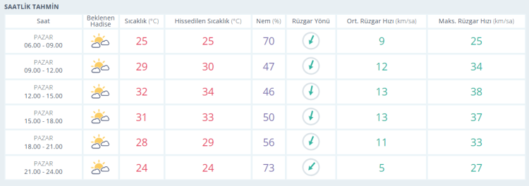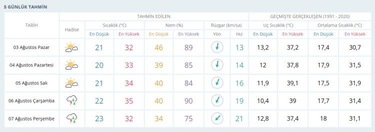 5 Ağustos Salı: Parçalı bulutlu.En düşük sıcaklık 21, en yüksek sıcaklık 34 derece olacak.