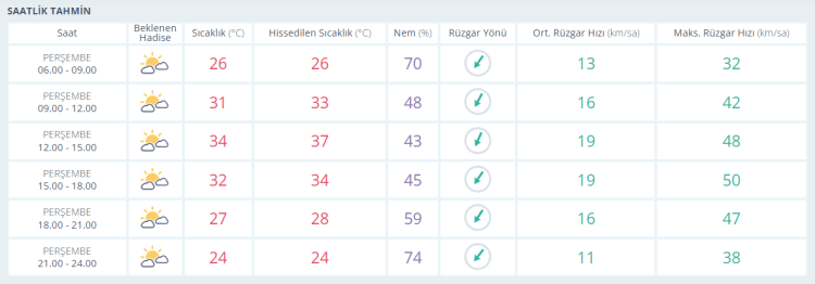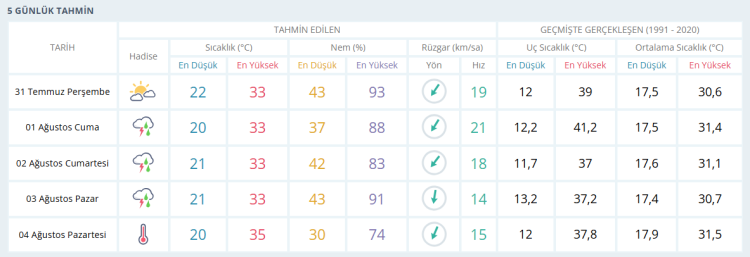 31 Temmuz Perşembe: Parçalı bulutlu. En düşük sıcaklık 22, en yüksek sıcaklık 33 derece olacak.