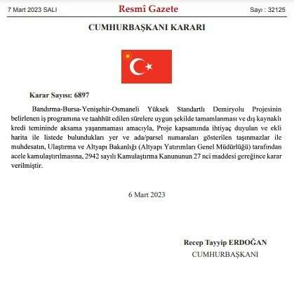 Resmi Gazetede yayımlanan 6897 sayılı kararda Bandırma - Bursa - Yenişehir - Osmaneli Yüksek Standartlı Demiryolu Projesinin belirlenen iş programına ve taahhüt edilen edilen sürelere uygun şekilde tamamlanması ve dış kaynaklı kredi temininde aksama yaşanmaması amacıyla, proje çerçevesinde ihtiyaç duyulan ve ekli harita ile listede bulundukları yer ve ada/parsel numaraları gösterilen taşınmazlar ile muhdesatın, Ulaştırma ve Alt Yapı Bakanlığı (Altyapı Yatırımları Genel Müdürlüğü) tarafından acele kamulaştırılmasına, 2942 sayılı Kamulaştırma Kanununun 27. maddesi gereğince karar verilmiştir." denildi.