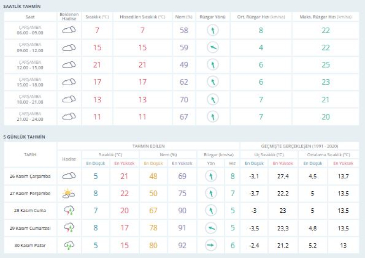 26 Kasım Çarşamba: Çok bulutlu bir hava etkili olacak. Sıcaklıklar 5°C ile 21°C arasında değişecek.
