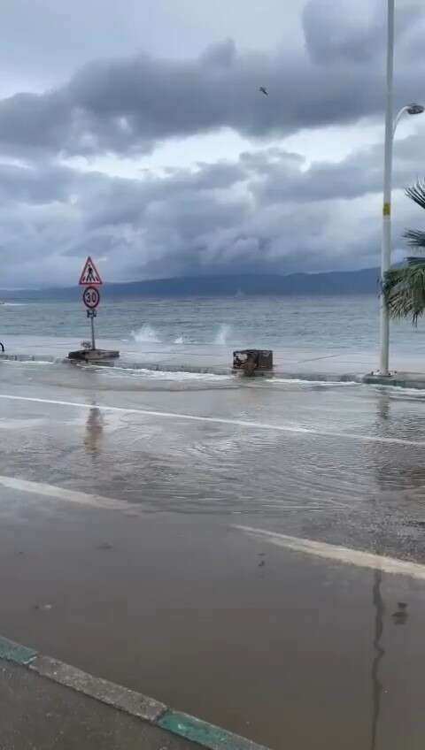 Alınan bilgiye göre, sabah saatlerinde etkili olan sağanak yağış Gemlik ilçesi Kurşunlu Sahili'nde denizin taşmasına sebep oldu. Dev dalgalar sahili döverken, deniz suyunun yükselmesi sonrası karayolu sular altında kaldı.