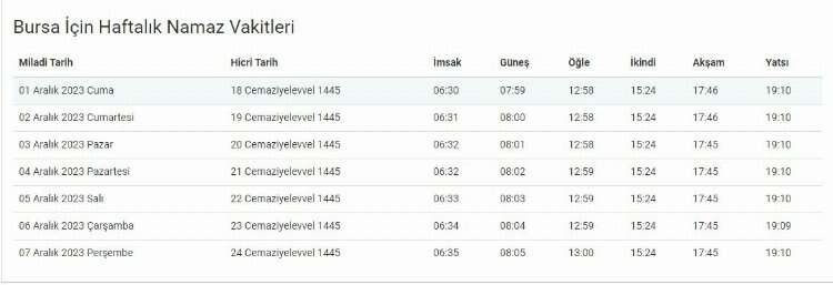 BURSA NAMAZ VAKİTLERİ 2023 HAFTALIK TABLO: