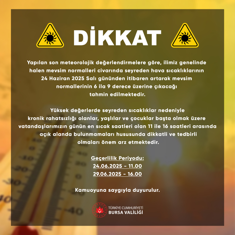 ‘Yapılan son meteorolojik değerlendirmelere göre, ilimiz genelinde halen mevsim normalleri civarında seyreden hava sıcaklıklarının 24 Haziran 2025 Salı gününden itibaren artarak mevsim normallerinin 6 ila 9 derece üzerine çıkacağı tahmin edilmektedir.