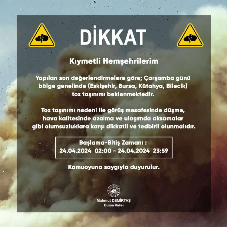 "Yapılan son değerlendirmelere göre; Çarşamba günü bölge genelinde (Eskişehir, Bursa, Kütahya, Bilecik) toz taşınımı beklenmektedir. Toz taşınımı nedeni ile görüş mesafesinde düşme, hava kalitesinde azalma ve ulaşımda aksamalar gibi olumsuzluklara karşı dikkatli ve tedbirli olunmalıdır."