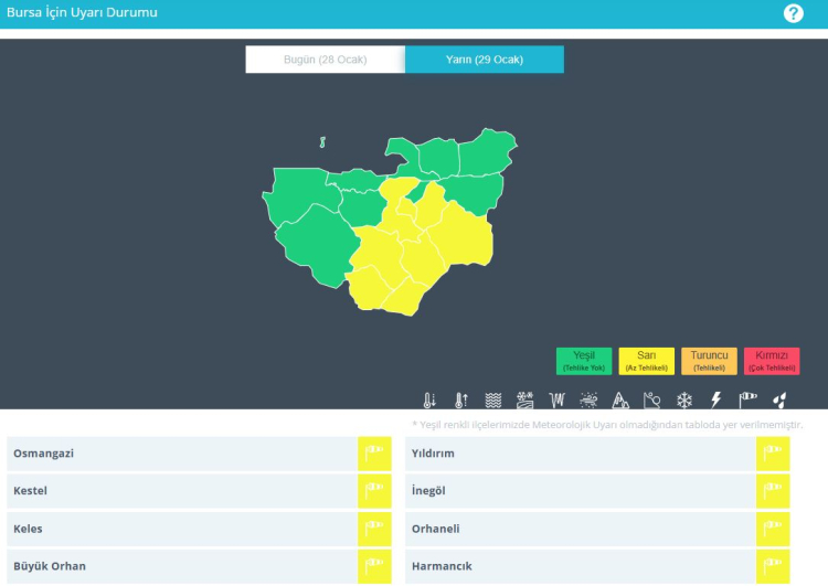 Meteoroloji Genel Müdürlüğü 29 Ocak’tan itibaren birçok ilde etkili olması beklenen kuvvetli rüzgar, fırtına ve sağanak yağışlara karşı vatandaşları uyardı. Bursa, Eskişehir, Kütahya ve Bilecik bölgesi için de “sarı” kodlu alarm verildi.