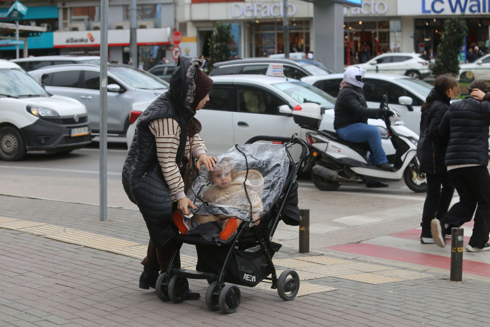 Aileler, bebeklerinin şiddetli lodostan etkilenmemesi için bebek arabalarına yağmurluk geçirirken, kimi vatandaşlar yürümekte zorluk çekti.