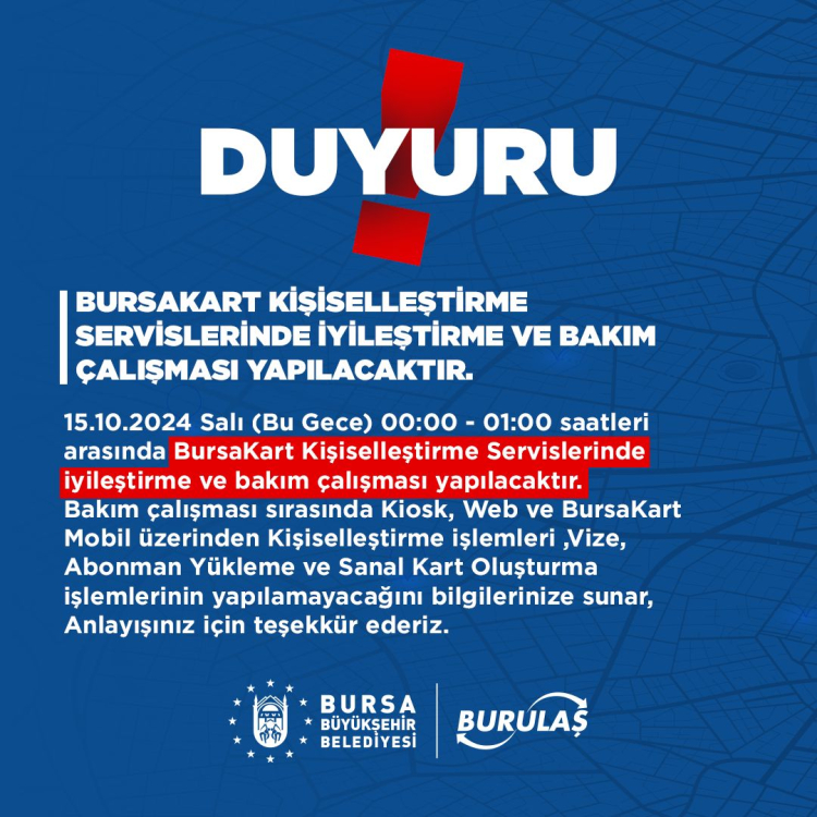 Bu bakım çalışması nedeniyle, belirli bir süre boyunca BursaKart kişiselleştirme işlemlerinde geçici olarak bir aksama yaşanabilir.