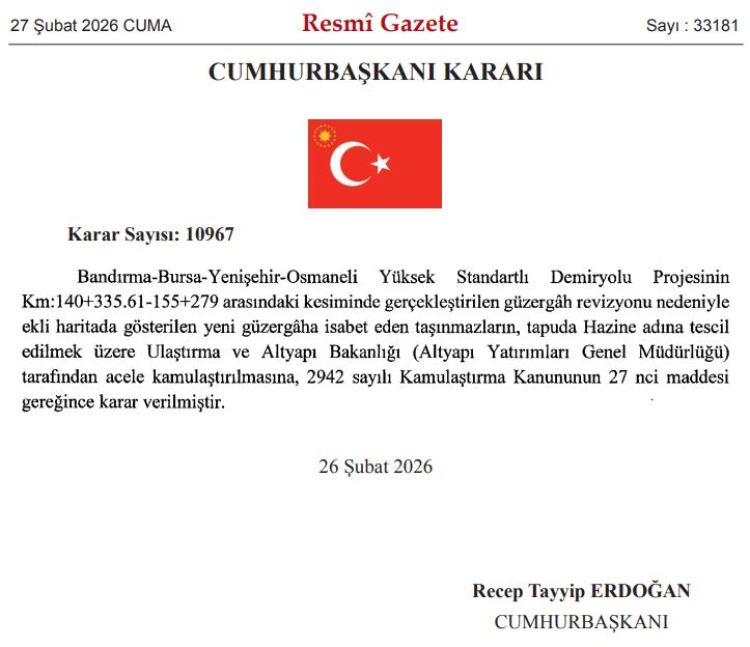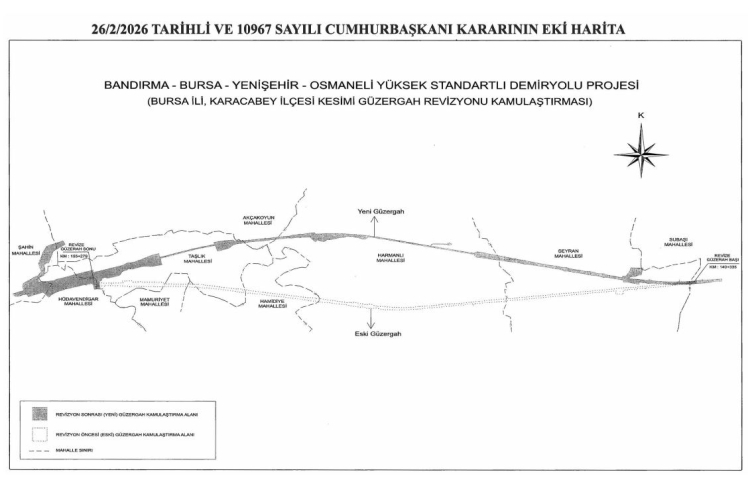 27 Şubat 2026 tarihli Resmî Gazete’de yayımlanan Cumhurbaşkanı Kararı ile Bandırma-Bursa-Yenişehir-Osmaneli Yüksek Standartlı Demiryolu Projesi’nin Bursa etabında güzergâh revizyonu nedeniyle acele kamulaştırma yapılacak. Karar, projenin Karacabey ilçesi sınırlarındaki bölümünü kapsıyor.