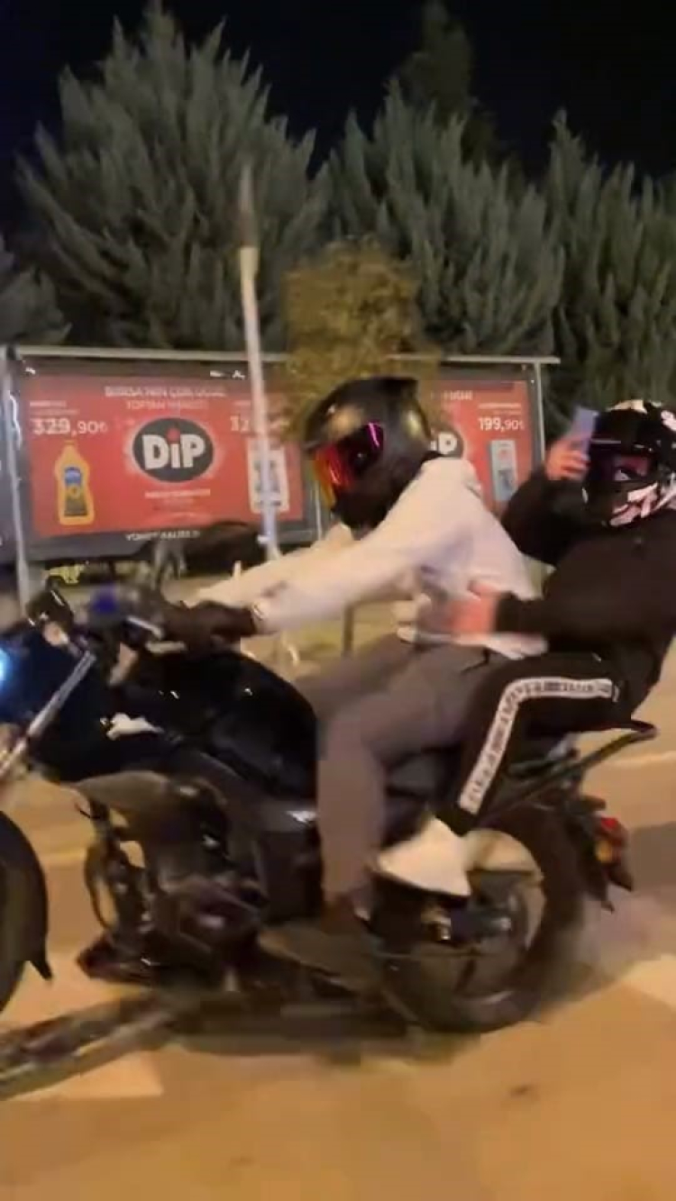 Adrenalin dolu anlar yaşamak isteyen sürücü, motosikletinin ön tekerleğini havaya kaldırarak (tek teker) ilerlemeye çalıştı. Ancak saniyeler içinde direksiyon hâkimiyetini tamamen kaybeden sürücü, arkasında bulunan yolcuyla birlikte motosikletten fırlayarak asfalt zemine savruldu.