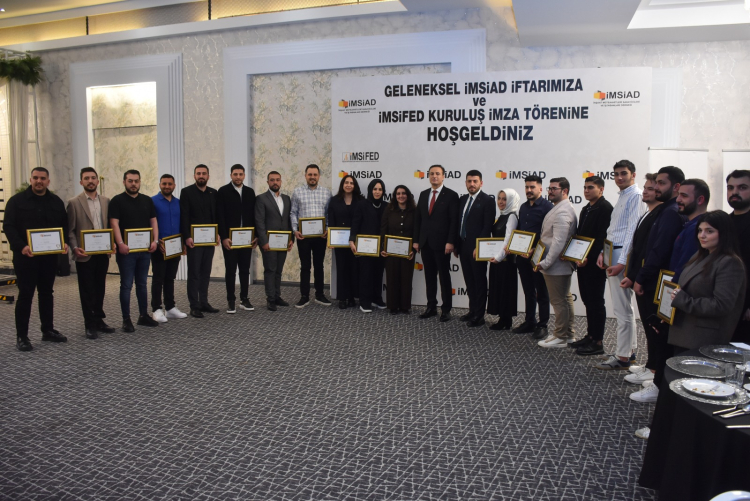 Son olarak, İMSİAD Yönetim Kurulu Başkanı Şeref Demir ve protokol üyeleri, yeni kurulan Genç İMSİAD’ın kurucu üyelerine beratlarını takdim etti.